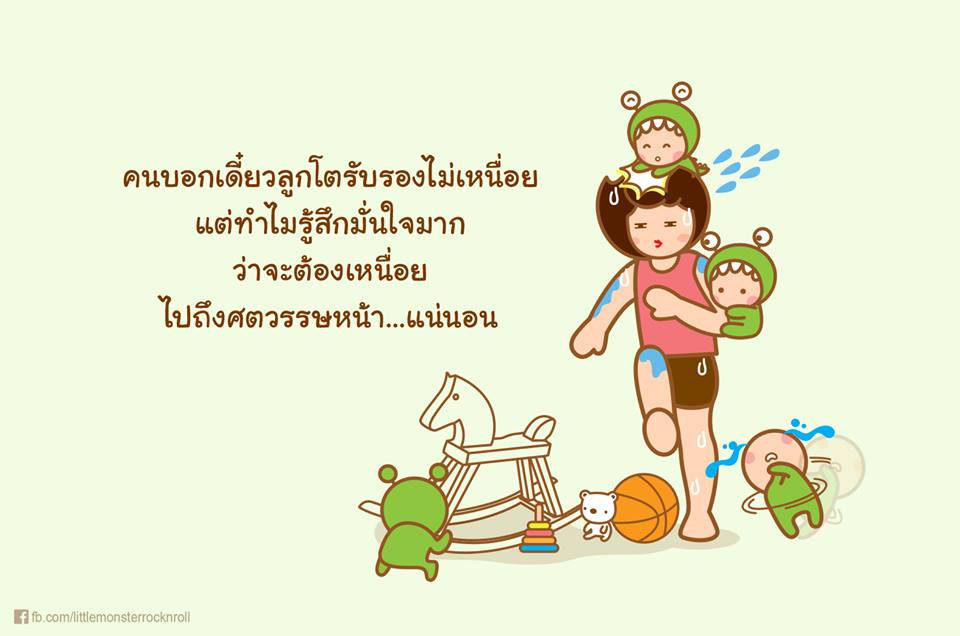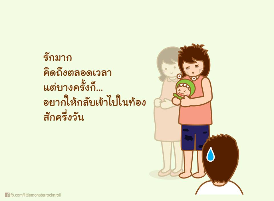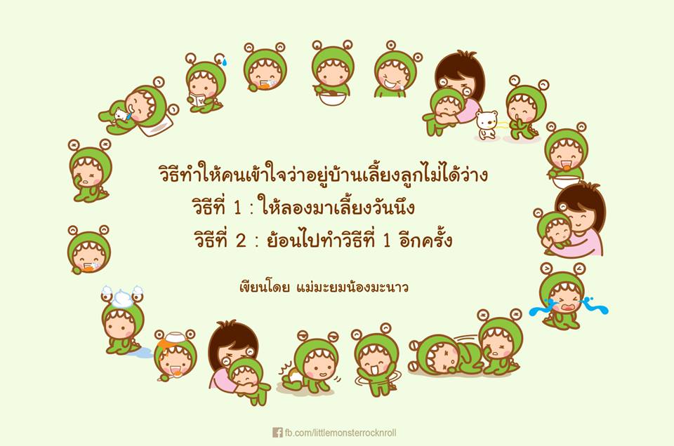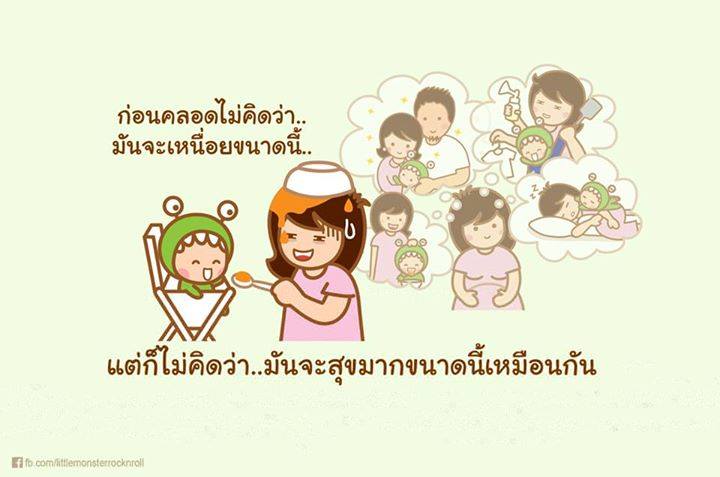 “จุดเริ่มต้นของเพจเกิดจากเรารู้สึกเศร้ากับการที่ยังปรับชีวิตในฐานะแม่ไม่ได้ ในช่วงแรกก็ว่าจะเข้าไปที่ facebook ตัวเองแล้วก็พิมพ์ status บ่นๆๆ แต่ก็ไม่ได้ทำเพราะรู้สึกไม่อยากเป็นแม่ที่ขี้บ่นมาก เลยไปบ่นกับสามีแทน จนเขาคงกลัวเราจิตตก หรือไม่ก็คงกลัวเราเหวี่ยงเขาเยอะไปมั้ง เลยแนะนำให้เราเขียนไดอารี่ แล้วก็ทำเพจการ์ตูนบอกความคิด ความในใจของคนเป็นแม่ ให้แม่มีจุดยืนที่เด่นชัดมากขึ้นอะค่ะ”